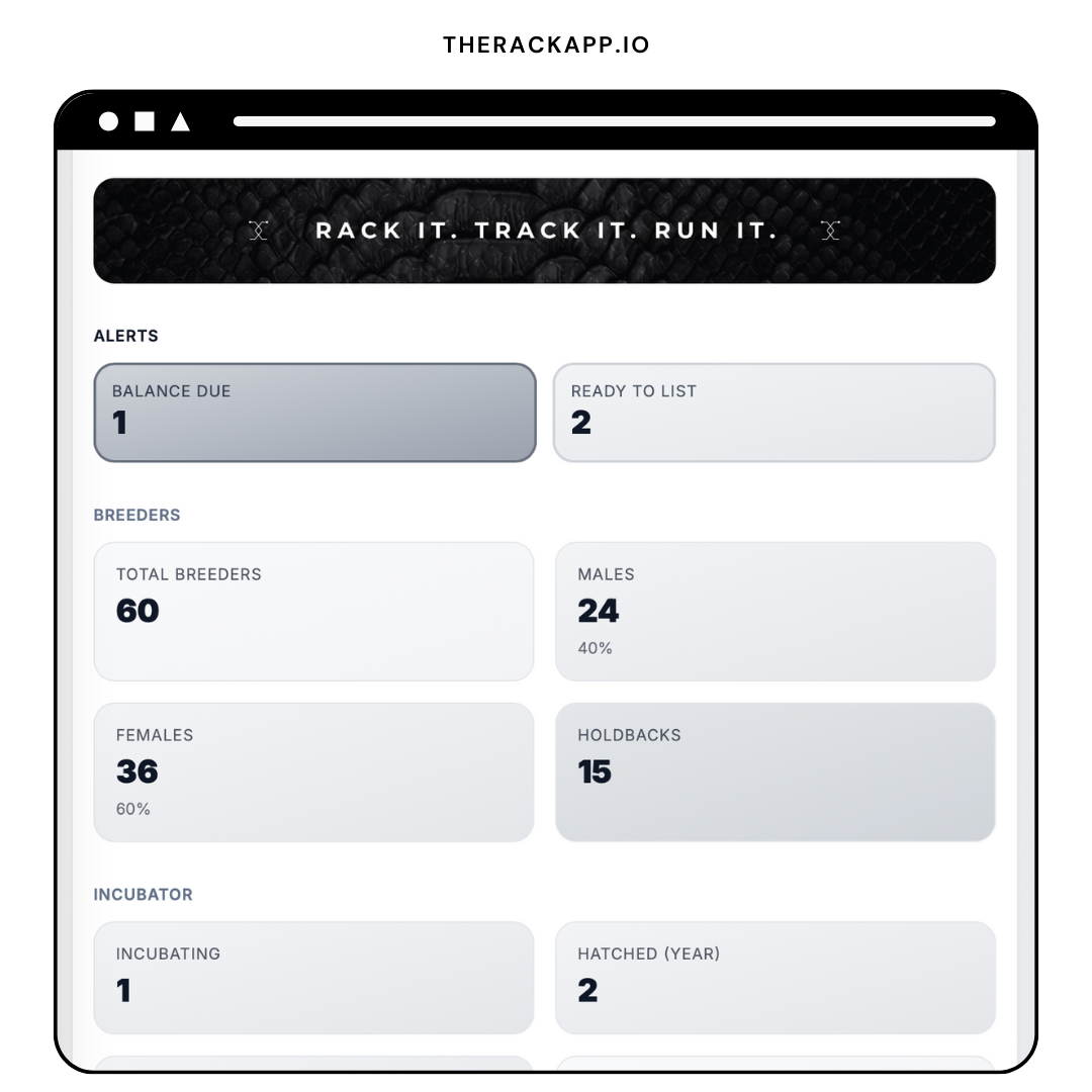 The Rack is intentionally focused. We did not try to build a 100-item menu. We built the 15 dishes that breeders actually need, and we made them really good. Collection management. Clutch tracking. Sales. Activity logs. A dashboard that tells you what is urgent. QR codes for fast logging. That is it.